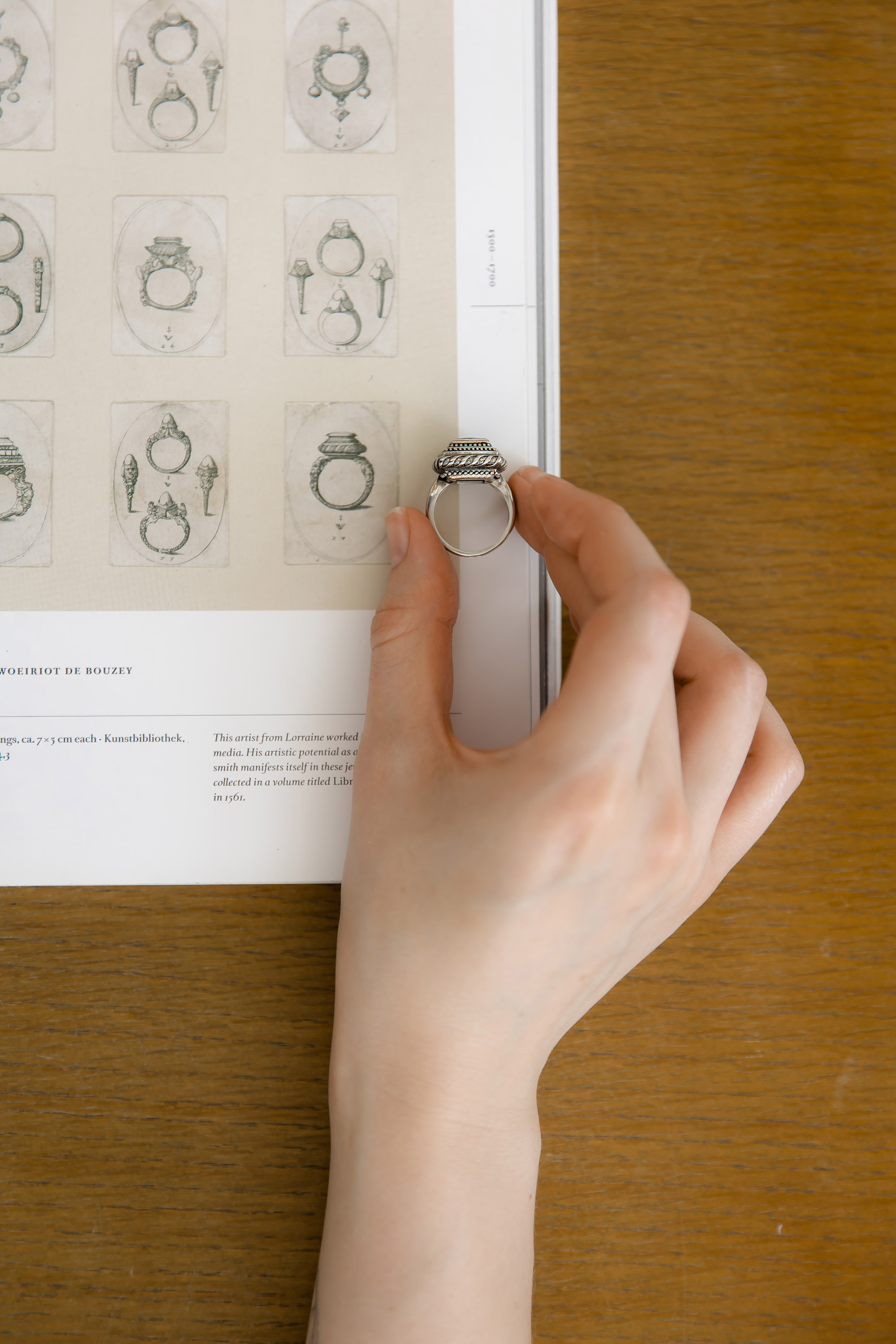 При создании коллекции родилось два кольца. Прототипом первого стал реальный ювелирный эскиз 16 века. Акцентное кольцо с высокой декоративной частью на эскизе было представлено только «в профиль». Поэтому мы сами додумали, каким оно может быть, добавив вставку из горячей эмали синего оттенка, имитируя камень.